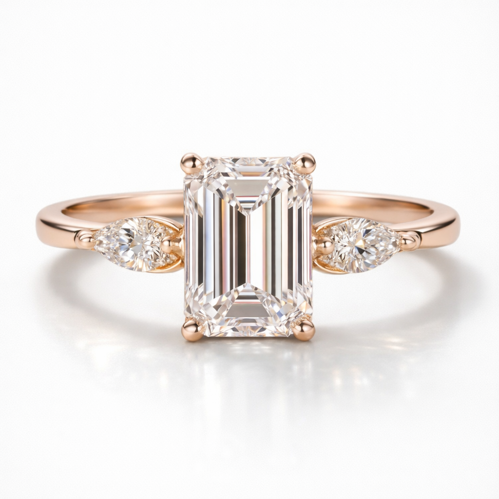 Emerald & Pear Cut Moissanite Diamond Engagement  Sterling Silver Ring