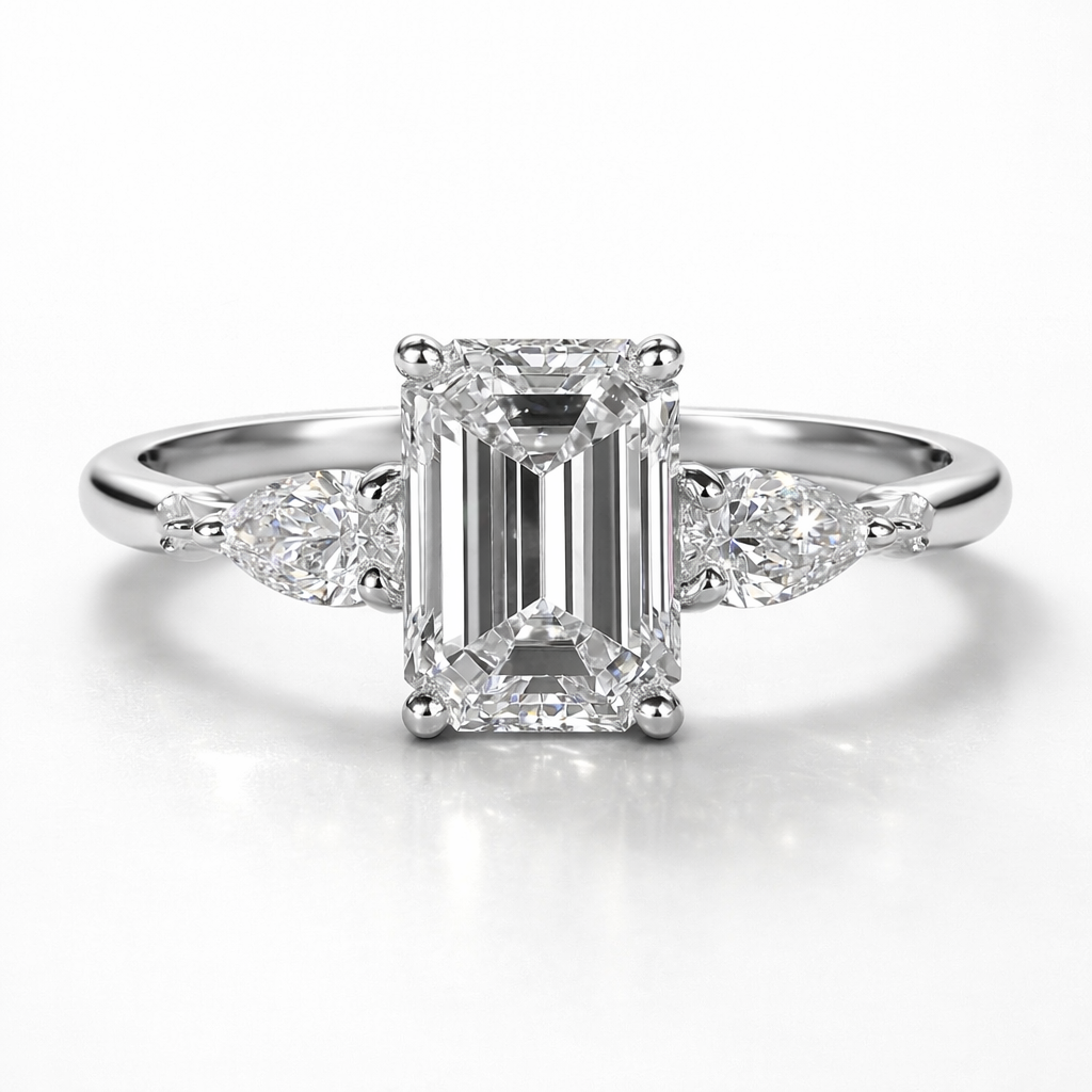 Emerald & Pear Cut Moissanite Diamond Engagement Sterling Silver Ring